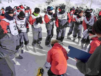 美味しいカレーを食べ、部屋に戻ってスキーウエアに着替えます。スキーブーツを履いて開校式の会場へ。スクールの校長先生からお話をいただき、みんなで記念撮影。何と、青空が見えてきました。午後は吹雪く予報だったのに・・・。インストラクターさんに連れられ、いざゲレンデへ!