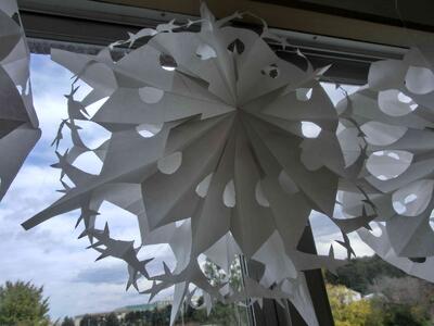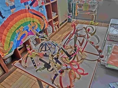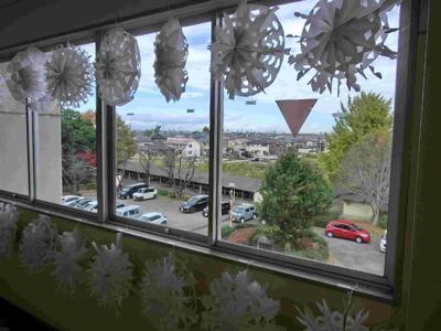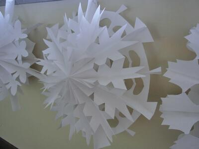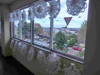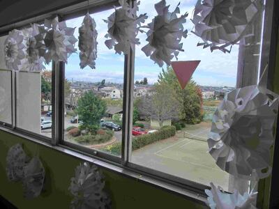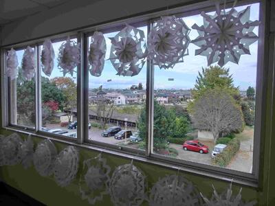 外から校舎を見上げると、3階の廊下の窓際一面に白い物体が。上がって間近で見ると、2年生の美術の作品でした。同じように見えて、一つ一つまったく違う模様になっていて、どうやったらこうなるのか頭が混乱しました。美術の先生が時間を見つけて展示しています。ありがたいですね。廊下に白い花が咲いたようです。