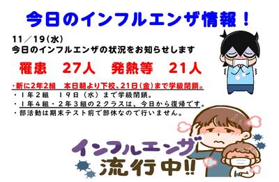 今日のインフルエンザ情報です。残念ながら2年2組が、21日(金)まで学級閉鎖となりました。先に閉鎖していた1年4組・2年3組は、今日から復帰となりました。なかなか治まりません。