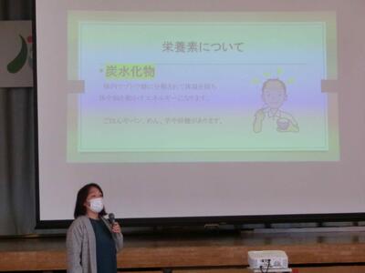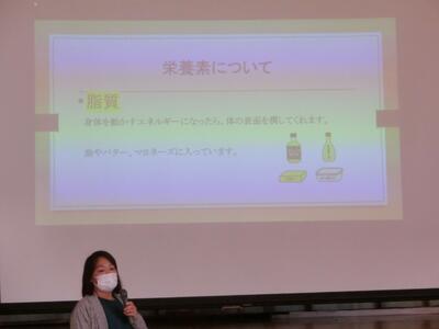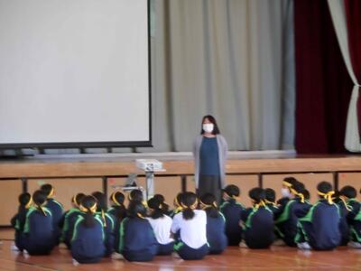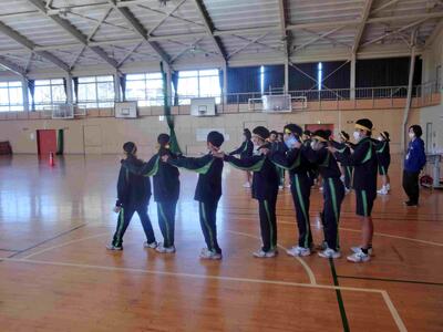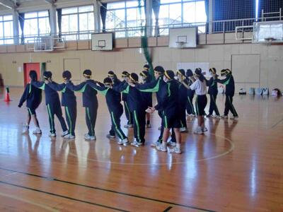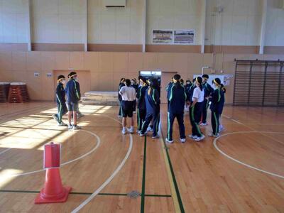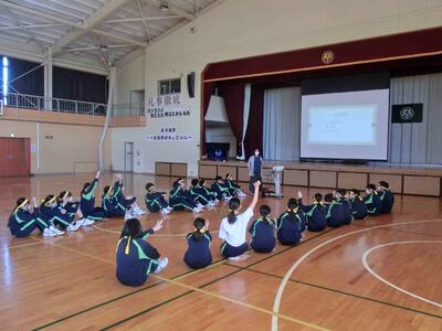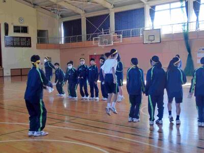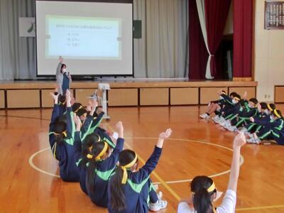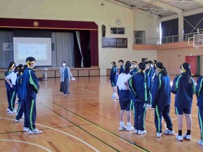 1年生体育。今日は保健分野の授業を行いました。「栄養と健康」について、栄養教諭の先生による授業です。。カロリー計算をして、それを消費するためにはどのくらい動かなければならないのか、実際に身体を動かして実感しました。また、必要な栄養素について、クイズを交えながら学びました。
