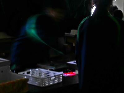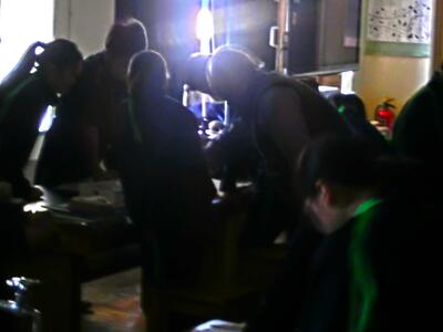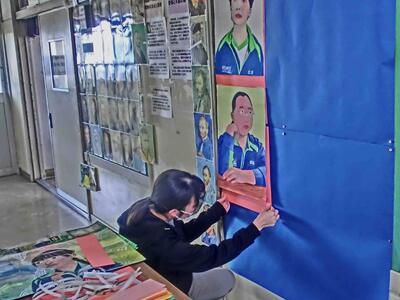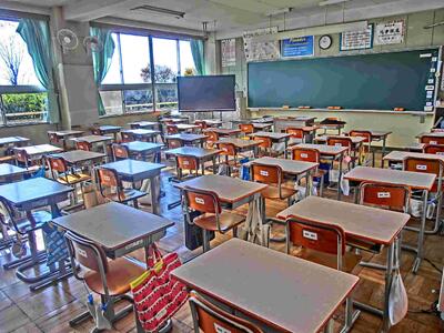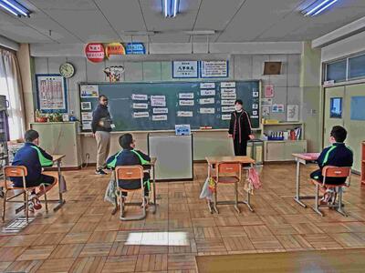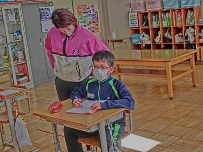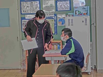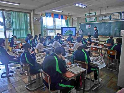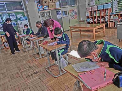 しろやま学級の英語、閉鎖中の淋しい教室、今日から復帰の1年2組、暗闇の中の1年生理科、光の実験、新たな作品を展示、美術の先生。これ以上、インフルエンザが広がりませんように!