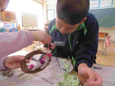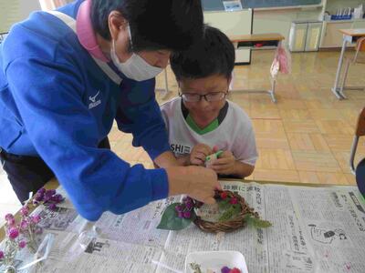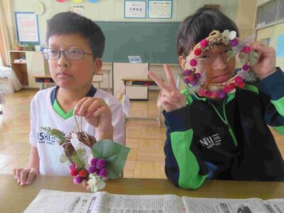 しろやま学級「家庭科」の時間。花壇の花を摘み、ドライフラワーにしたものをで「フラワーアレンジメント」を制作していたものが、今日、完成しました!名のとおり、自分でアレンジしながらグルーガンで接着。オンリーワンの飾りが完成です。ステキですよ!