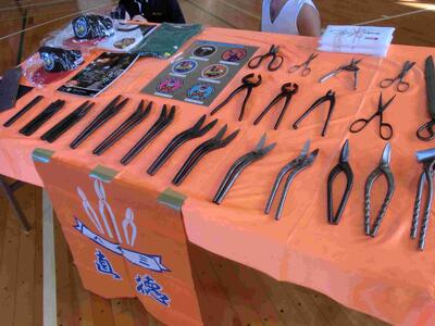 ◎自社の製品を展示。大きなハサミ、トタンも難なく切れるハサミ