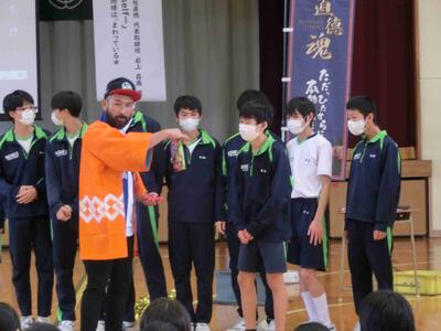 進路意識啓発講演会として、鴻巣市にある株式会社「直徳」代表取締役の岩上様を講師としてお招きし、お話をいただきました。「自分の軸 ーbe myself-」~青い地球はまわっている~をテーマに、破天荒な入場とは裏腹に熱いお話、メッセージを生徒たちに投げかけました。失敗を恐れず、チャレンジしていくこと。何もしなければ、チャレンジしなければ成功は生まれないという、自身の経験から得たこと、そして、自分で最終決断をするという「勇気」をもらいました。