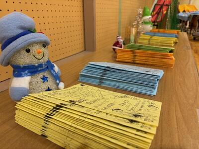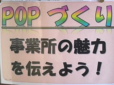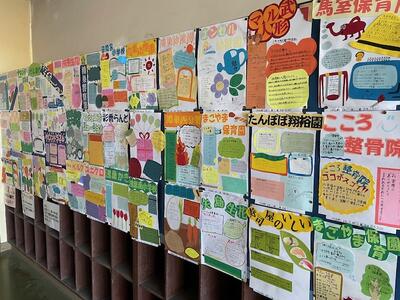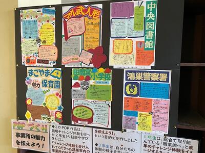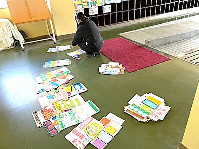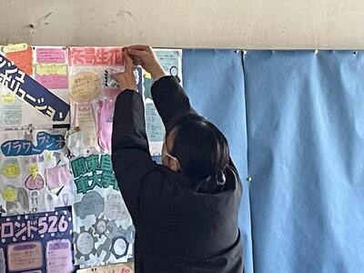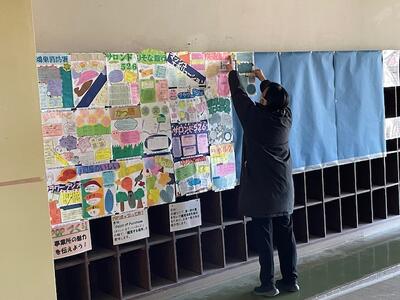 ご苦労様です!美術の先生が、作品の展示作業をしていました。2年生による、事業所の魅力を伝える「ポップ」です。どれも面白い作品ばかりです。3学期始まったら見てくださいね。