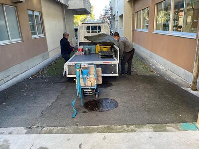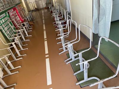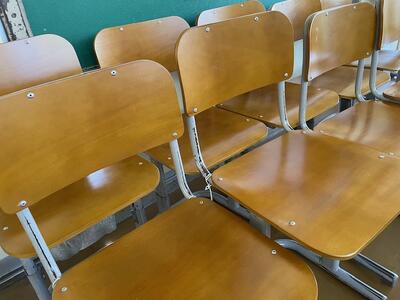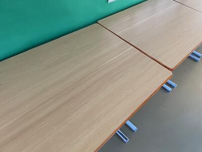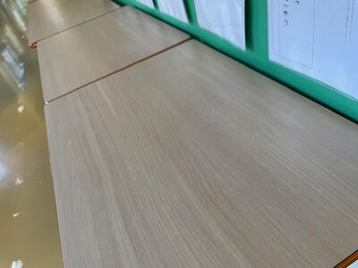 25日(木)、26日(金)の2日間で、机の天板と、椅子の背板、座面の張替作業を業者の方に行っていただいています。ありがとうございます。市の予算の関係で、痛みが大きい物のみの限られた対応になってしまいますが、これで、天板に穴が空いていたり、座るとささくれで服が引っかかったりすることはなくなりますね。