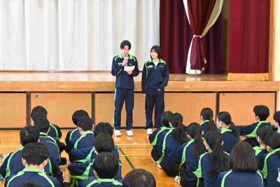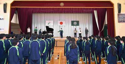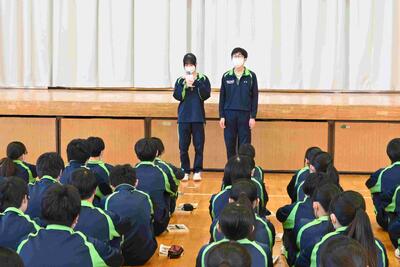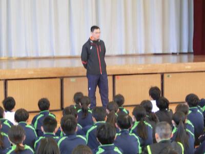 今日は、それぞれの学年が、2学期まとめの学年集会を行います。まずは、3年生から。各クラスの学年委員が振り返りをのべ、3学期に向けて意識を高めました。生徒たちから学年の先生に向けて「つぼみが開くように」の大合唱のサプライズ。先生方、喜んでいました。最後は学年主任、進路指導主事からの話で締めくくられました。