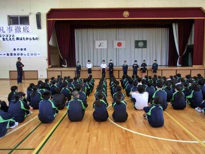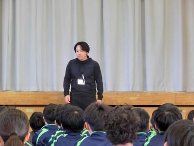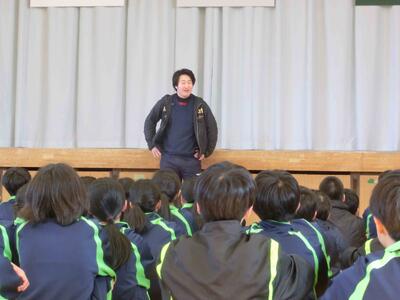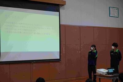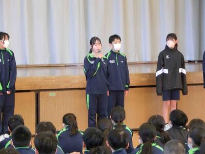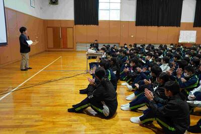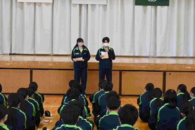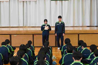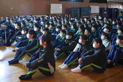 1年生の学年集会です。落ち着いた態度、さらに成長した姿がありました。各クラスの学年委員からの振り返り、各担当の先生方からの話を聞きました。1年生は、1月には学年最大の行事「スキー林間学校」があります。参加者全員が無事出発できるように、過ごし方を考えた冬休みにしなければなりませんね。
