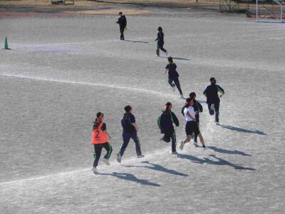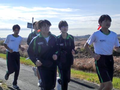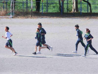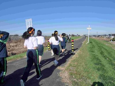 3年生体育の長距離走、今日は土手を走るコースに出ました。片道1、5kmのコースを一往復、集団で走って確かめました。ウオーキングをしている市民の方に「頑張って!」と声を掛けられていました。寒いのは最初だけ、走り終わるといい汗ですね!