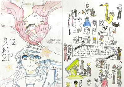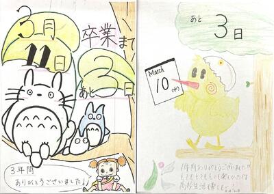 おはようございます。今日の卒業までのカウントダウンカレンダーです。卒業式予行が予定されています。全校揃って動きの確認をする大切な時間。予行であっても、緊張感を持って臨みましょう。