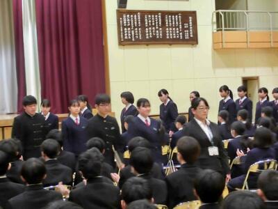 卒業式予行が行われました。3年生の立派な態度を見て、1,2年生も気持ちが引き締まります。本番さながらの予行となりました。式はスムーズに流れ、(もちろん送辞・答辞・卒業生合唱は本番までベールを脱ぎませんが)所作等確認ができました。あとは、1,2年生の先輩を送り出す気持ちが更に高まれば、きっと良い式になるはずです。