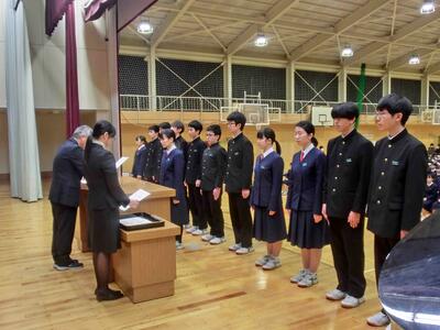 卒業式予行後に、3年生最後の表彰を行いました。特別表彰(県教育委員会・体育優良・産業教育・赤十字)・学校長顕彰(しろやま賞・自学ノート)です。多くの生徒が表彰を受けました。おめでとうございます!