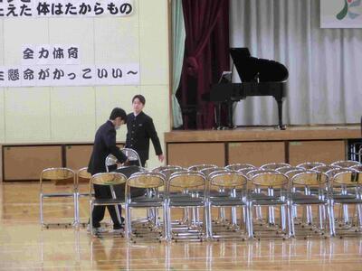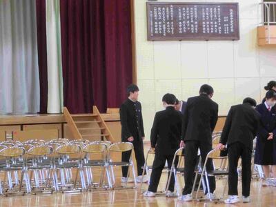 予行に先立ち、2年生が全員で式場の準備をしました。みるみるうちに椅子が整然と並べられ、予行開始前には完了しです。また、予行後の片付けも2年生。給食前の忙しい時間に全て終わりました。ご苦労様でした。来年は、あなたたちが主役ですよ!