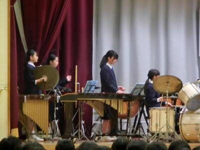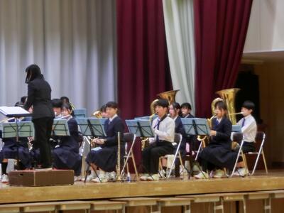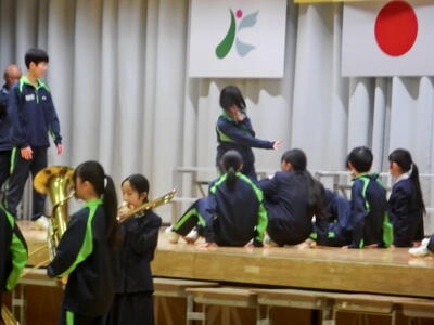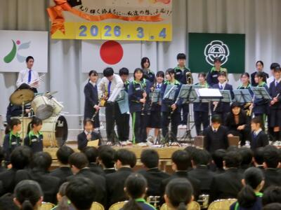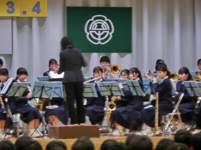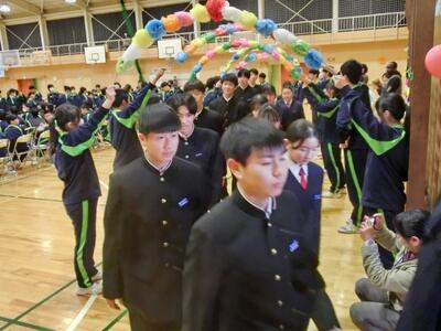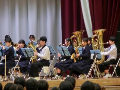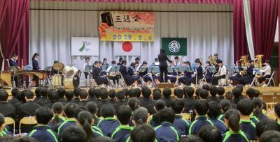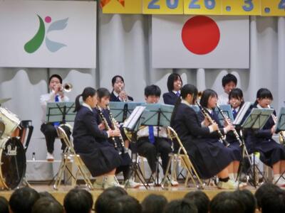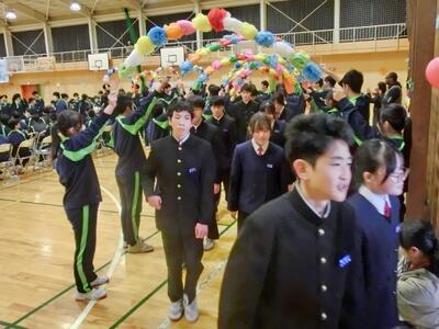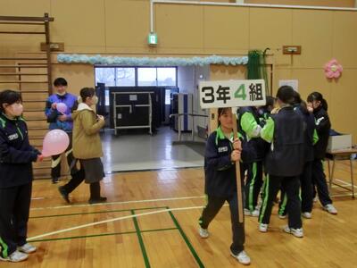 三送会が始まりました。吹奏楽部の演奏に乗って、少しの緊張や照れくささの面持ちで3年生の入場です。実行委員の司会・演出により会が始まりました。そして、吹奏楽部の演奏へと続きます。