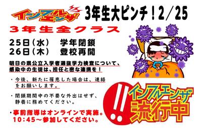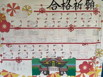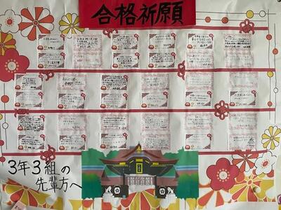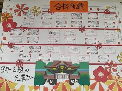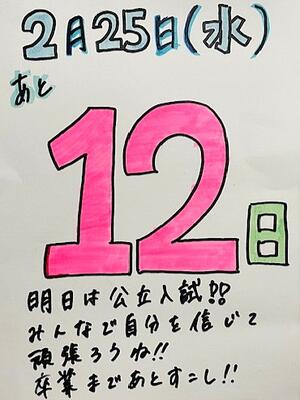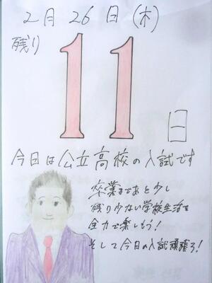 おはようございます。受験生の皆さん、起きて準備を進めていますか?長かった受験勉強の、いよいよ集大成となりますね。インフルエンザ流行により、前日まで閉鎖となりましたが、最後のまとめをするには、たっぷりと時間が取れたのではないでしょうか?とにかく、最後まで諦めず、問題と向き合ってきてください。健闘を祈っています!何かあったら、学校で待機していますので、連絡をください。がんばれ鴻巣西中3年生!!
