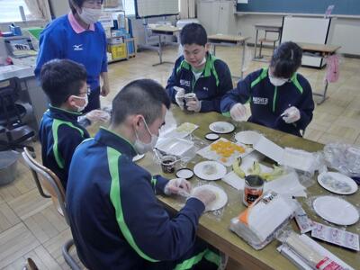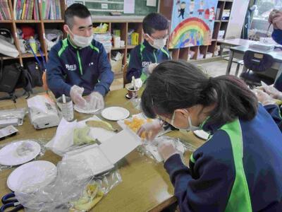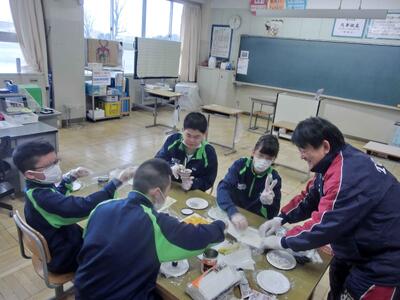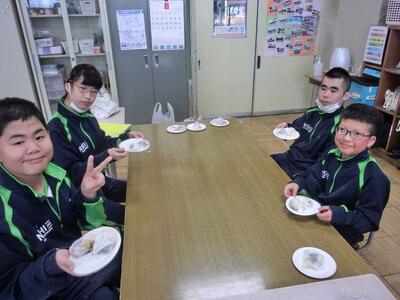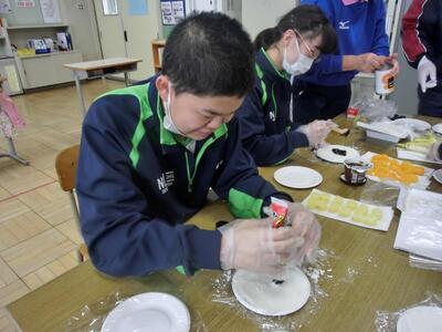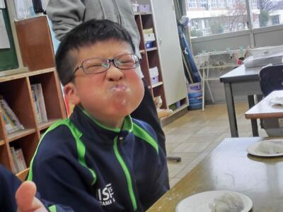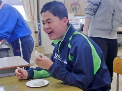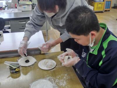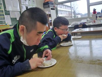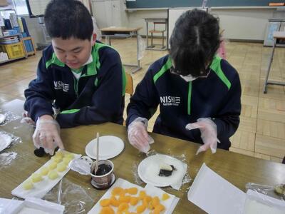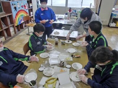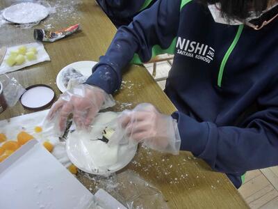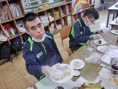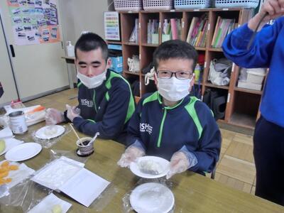 しろやま学級、今日はみんなが「和菓子職人」になりました。求肥(ぎゅうひ)にあんこやチョコ、バナナ、ミカン、パイナップルを乗せた「フルーツ大福」を作りました。粉だらけになりながらも、美味しいのが出来上がりました。口いっぱいに頬張って、美味しくいただきました。全員揃っての作業の時間は、今日で最後。楽しい思い出となりましたね。