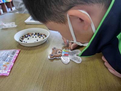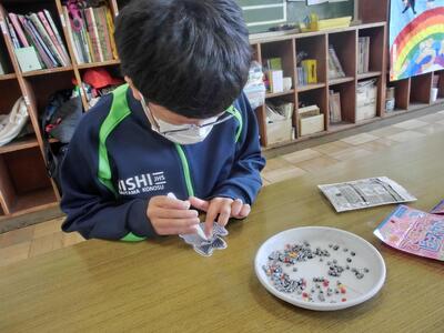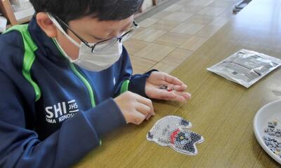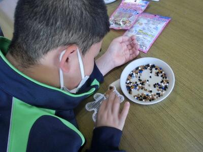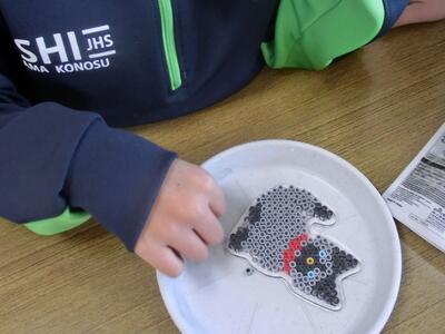 2月12日(木)しろやま学級 今日の作業は 投稿: 鴻巣西中学校 (16:08) しろやま学級、今日の作業の時間は2人だけでした。細かい手作業「アイロンビーズ」づくり。色を変えてオリジナル感を出しながら。以前はおしゃべりをしながらやると、手が止まってしまいましたが、今では楽しくおしゃべりしながらも、しっかり作業を進めることができるようになりましたね。明日、アイロンで固めて仕上げです! Tweet -