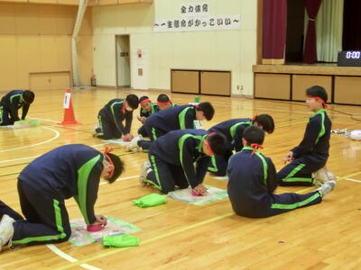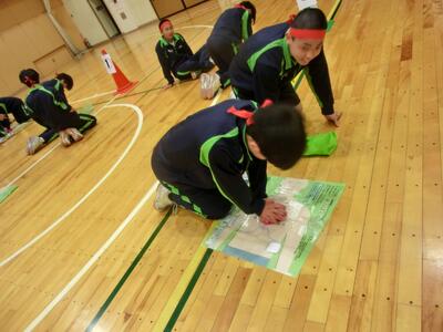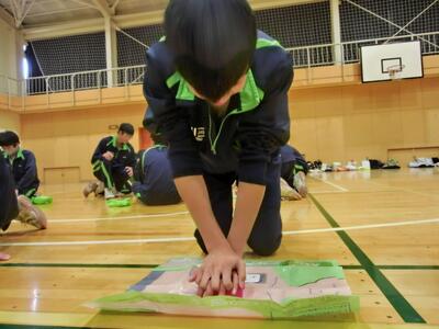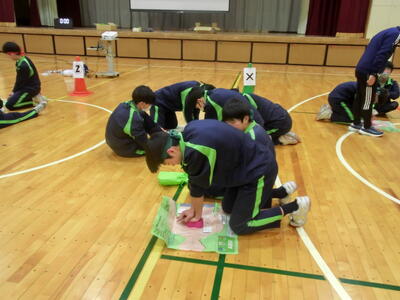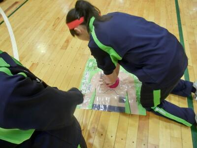 3月17日(火)2年体育「救命救急法」 投稿: 鴻巣西中学校 (12:19) 2年生体育の保健学習で、救命救急法を学びました。「あっぱくん」を使って、心肺蘇生法(胸骨圧迫マッサージ)を、2人1組で実習。①手のひらのどこで押す?②肘は?③押すタイミング・テンポは?など、確認しながら最後は2分間連続で行いました。いつ何時、このようなことが起こるか分かりません。もしその場に居合わせたら、勇気を持ってやってみてください。一人の命を救えるかもしれないのです。 Tweet -